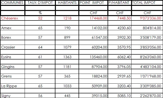 Aujourd'hui, Chéserex a un taux d'imposition de 52 points ce qui représenterait une augmentation de 16%.Ne nous méprenons pas, ce taux de 53% est illusoire et nous en doutons fortement car il est basé sur les résultats de 2012, mais applicable en 2017.